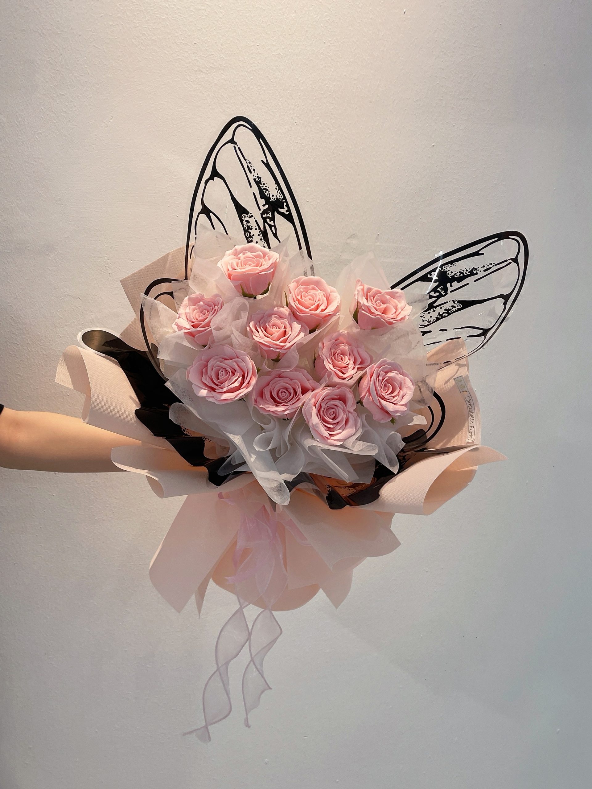 Details: 10 Stalks Soap Pink Roses + Pink Wrapping