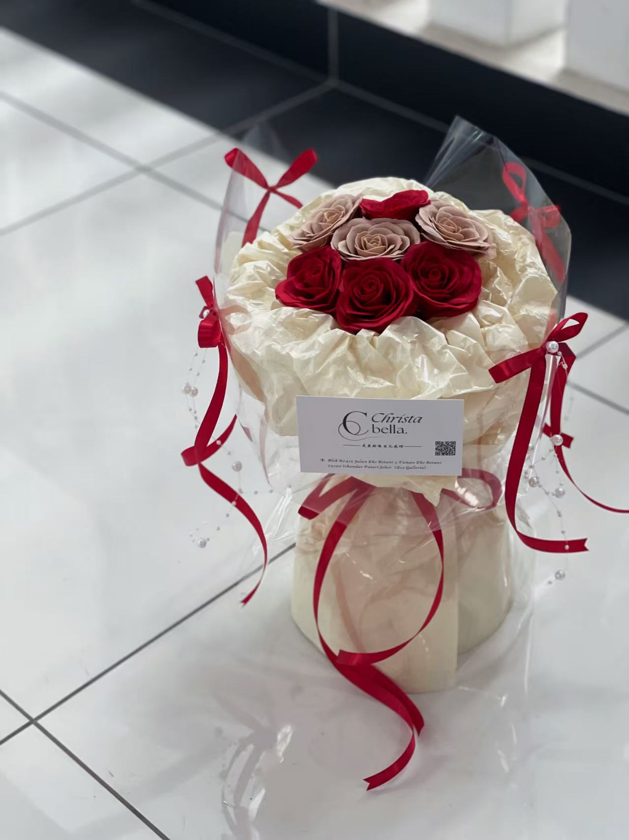 -4 Stalks Soap Red Roses + 3 Stalks Soap Cappuccinp Roses + Peral Chain (Cream Wrapping) S Size-RM135