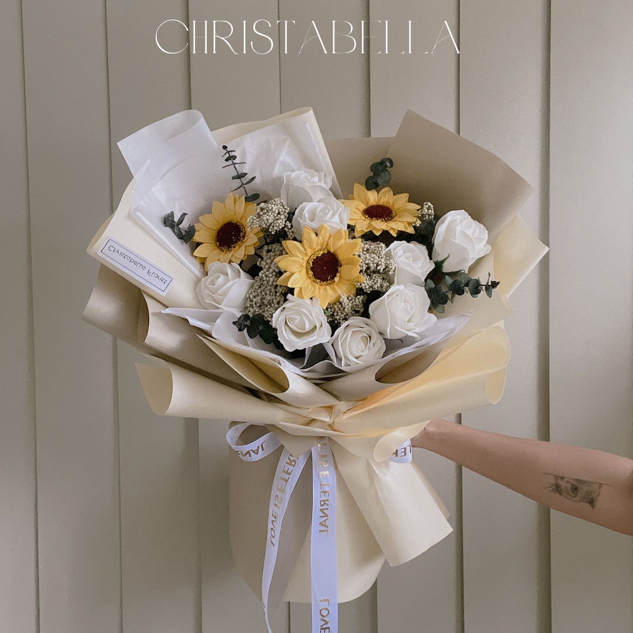 Details: 3 Stalks Sunflower + 8 Stalks White Roses + Preserved Fillers Rice Flower + Eucalyptus Leave + Cream Wrapping