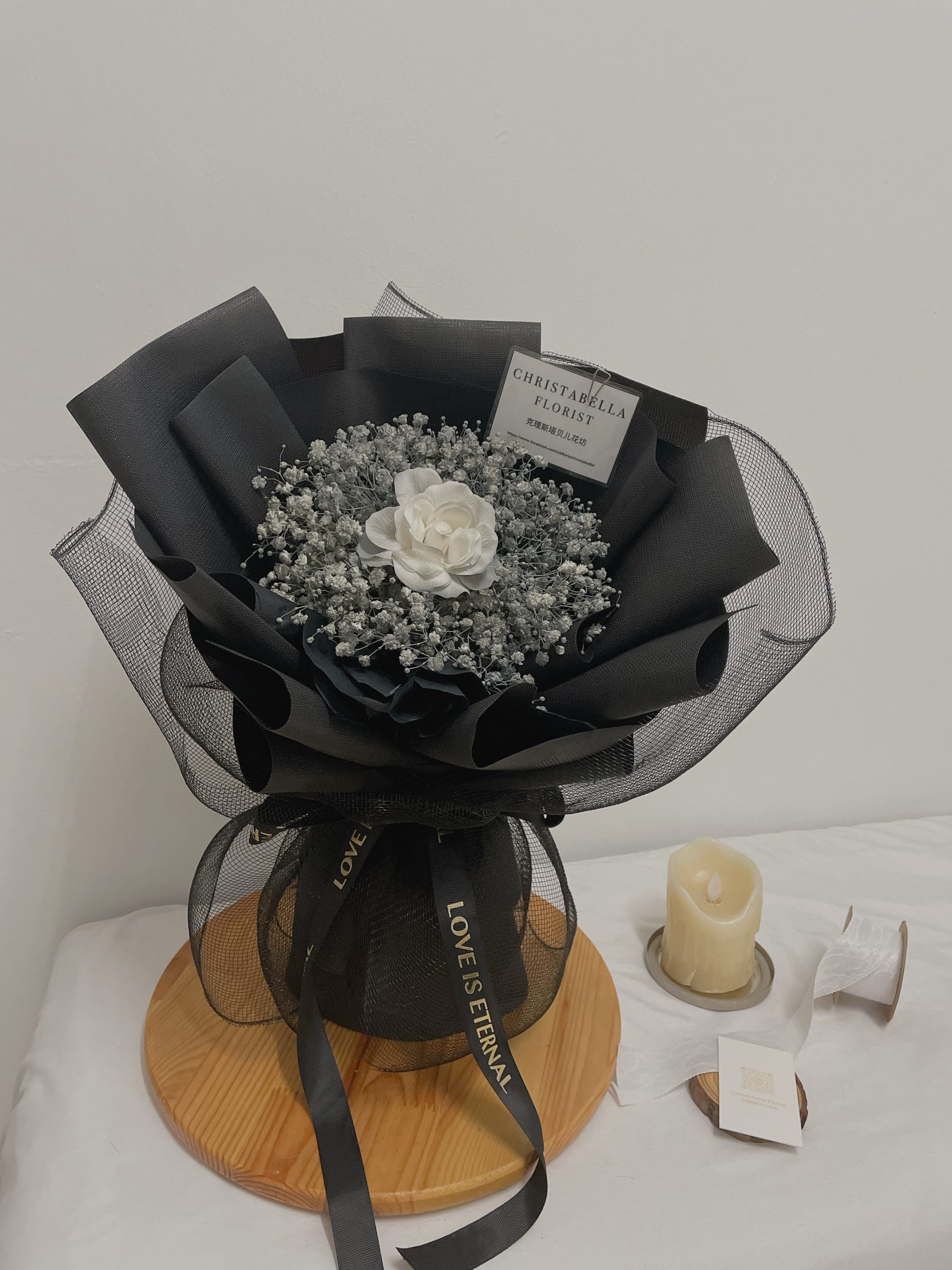 Details: 1 Stalks Soap White Roses + S Size Baby Breath + Cloth Mesh + Black Wrapping