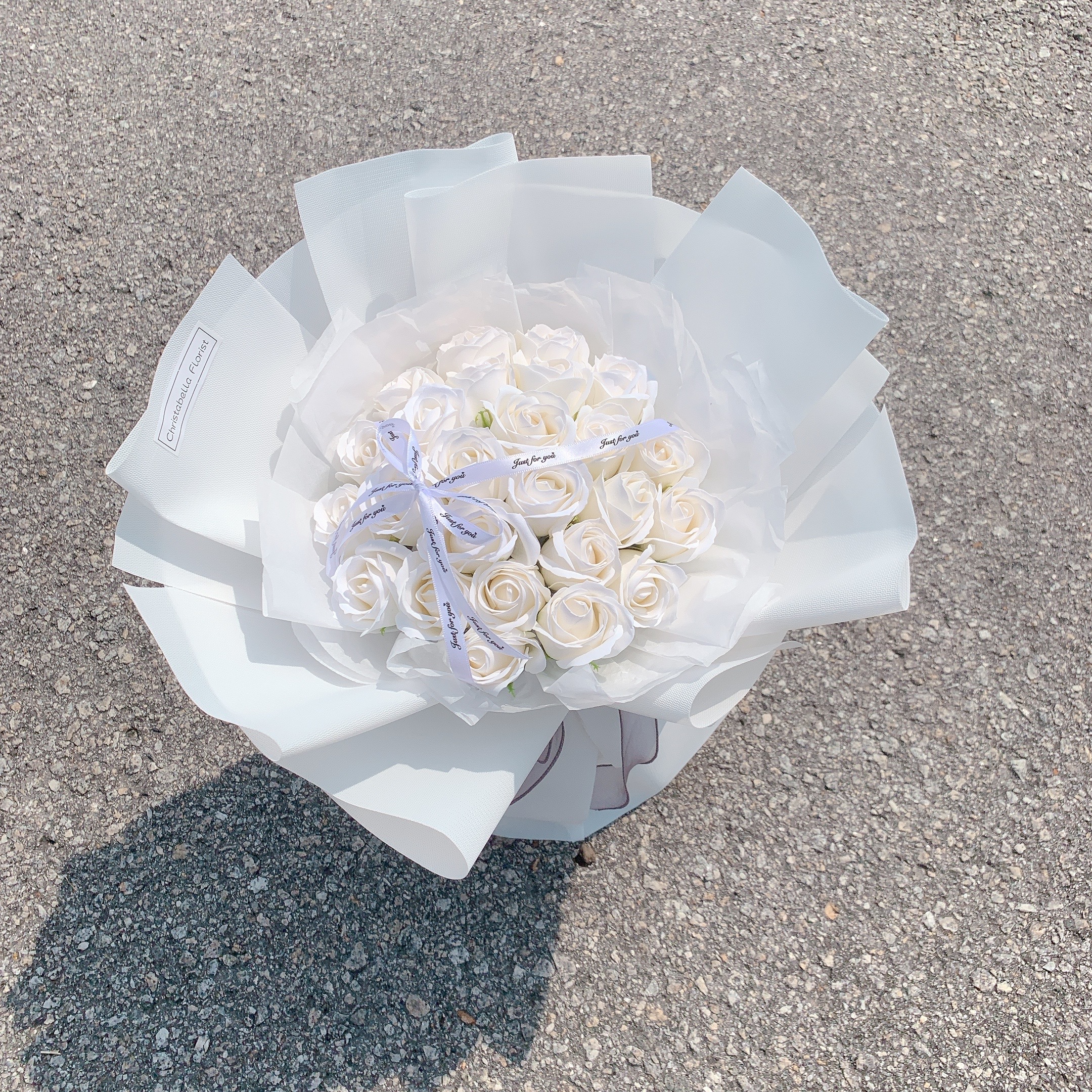 Details: 25 Stalks Soap White Roses + White Wrapping