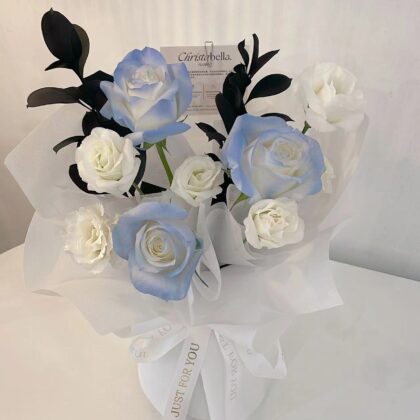 Fresh Mix Ombre Blue Roses & White Eustoma Flower Bouquet