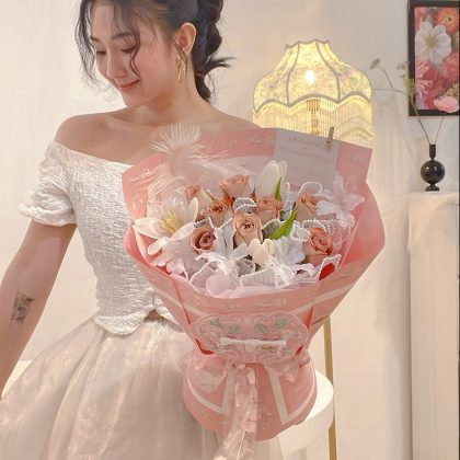 Fresh Mix Champagne Roses & White Eustoma Flower Bouquet