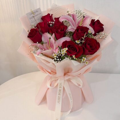 Fresh Mix Red Roses & Lily Flower Bouquet