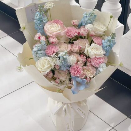 Fresh Mix Ombre Pink Roses & Blue Matthiola Flower Bouquet(520)