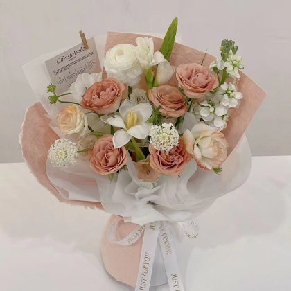 Fresh Mix Cappuccino Roses & White Tulip Flower Bouquet